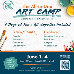 Join us for The All-in-One Art Camp, a fun and engaging 4-day experience where young artists explore a wide variety of creative skills, subjects, and mediums. This camp is taught by full-time professional artist Caleb Ceran, who brings years of experience as both a working artist and instructor. Students will learn how to draw and paint people, animals, cartoons, and landscapes while building confidence through clear, step-by-step guidance in a supportive and inspiring environment. Throughout the week, students will experiment with multiple mediums including pencil, charcoal, pen & ink, watercolor, and acrylic paint. All supplies are included—just bring your creativity! Each day is packed with hands-on projects, and students will leave with a collection of artwork to be proud of. Held from June 1–4, 9am–12pm, this camp is perfect for ages 8–12 and includes snacks and a take-home art set to keep the creativity going even after camp ends.
